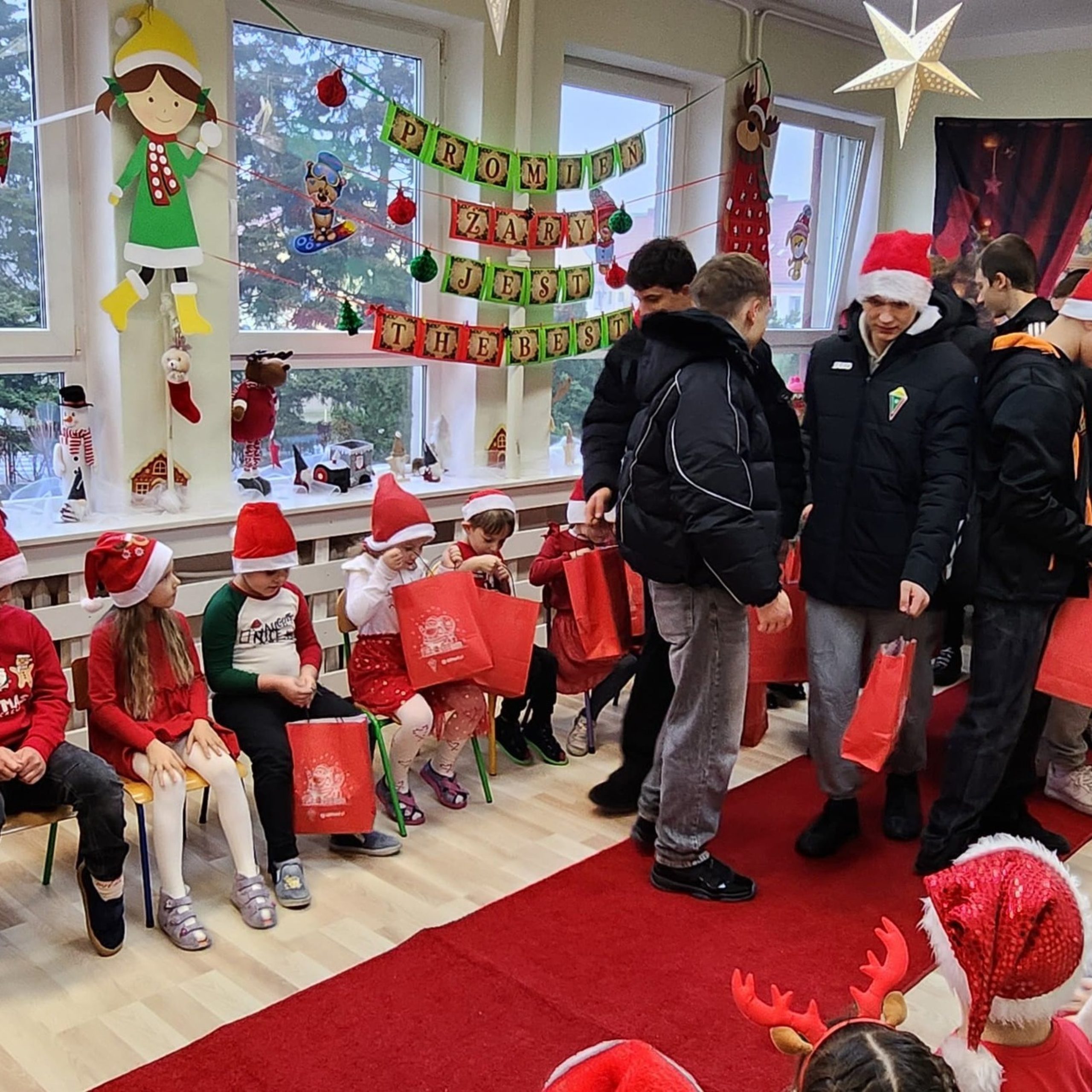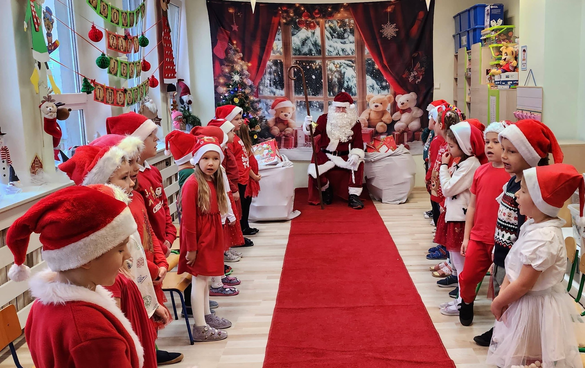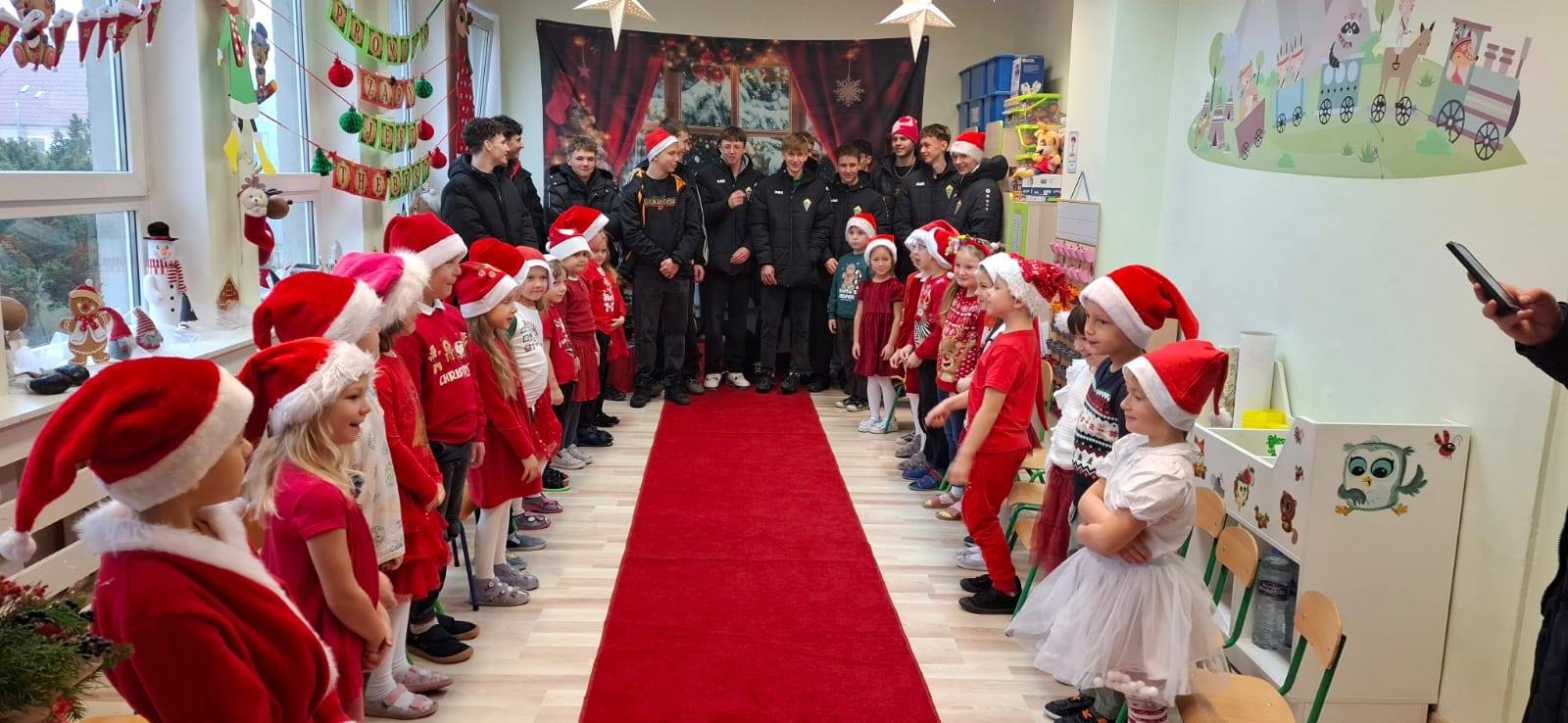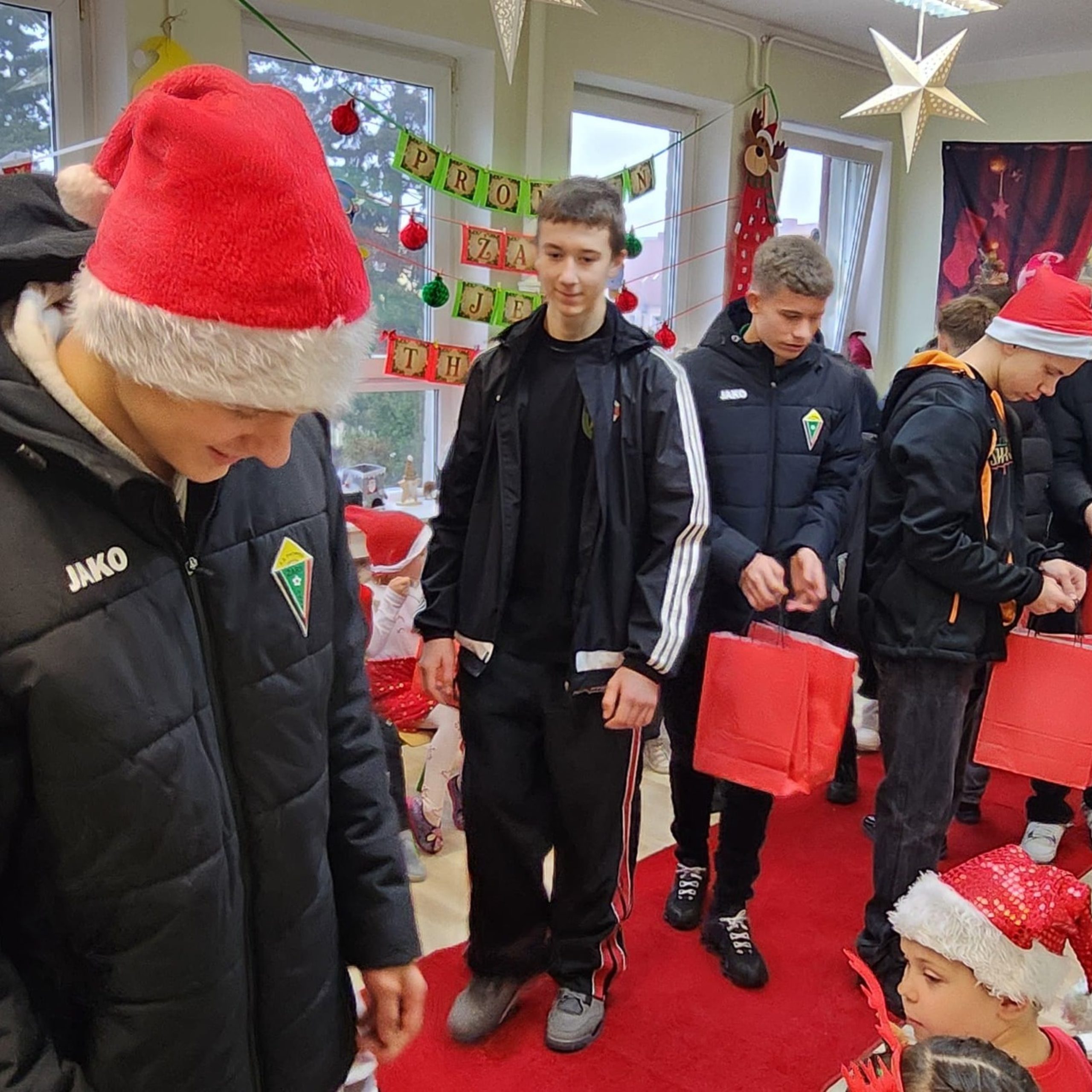 Dzieci przywitały go z ogromną radością śpiewając świąteczne piosenki. Mikołaj z uśmiechem ich wysłuchał, a następnie wręczył każdemu mały upominek. W sali panowała cudowna świąteczna atmosfera, a na ich twarzach można było zobaczyć prawdziwą radość i wzruszenie .Dziękujemy naszym przyjaciołom z KS Promień Żary za coroczne odwiedziny