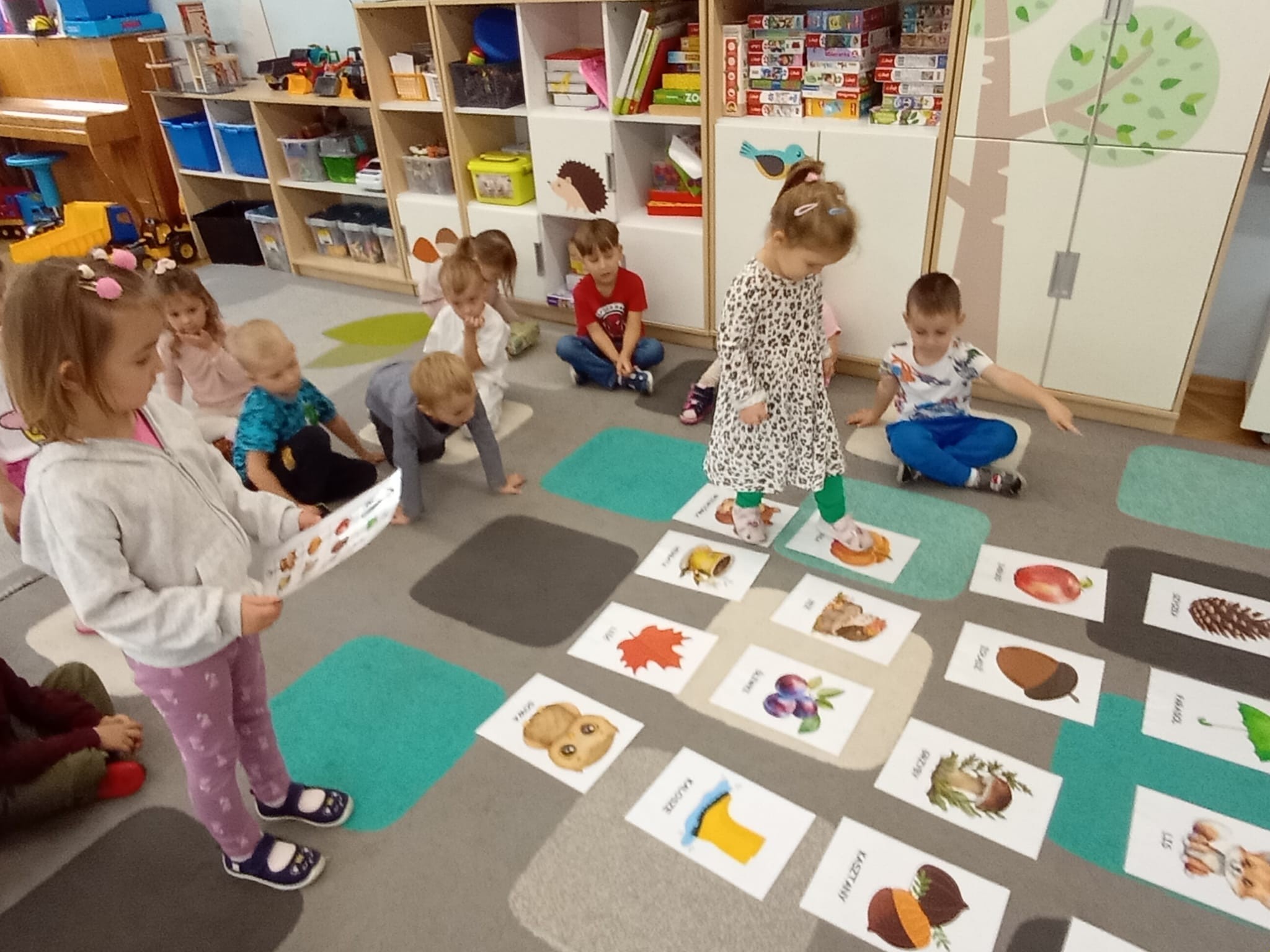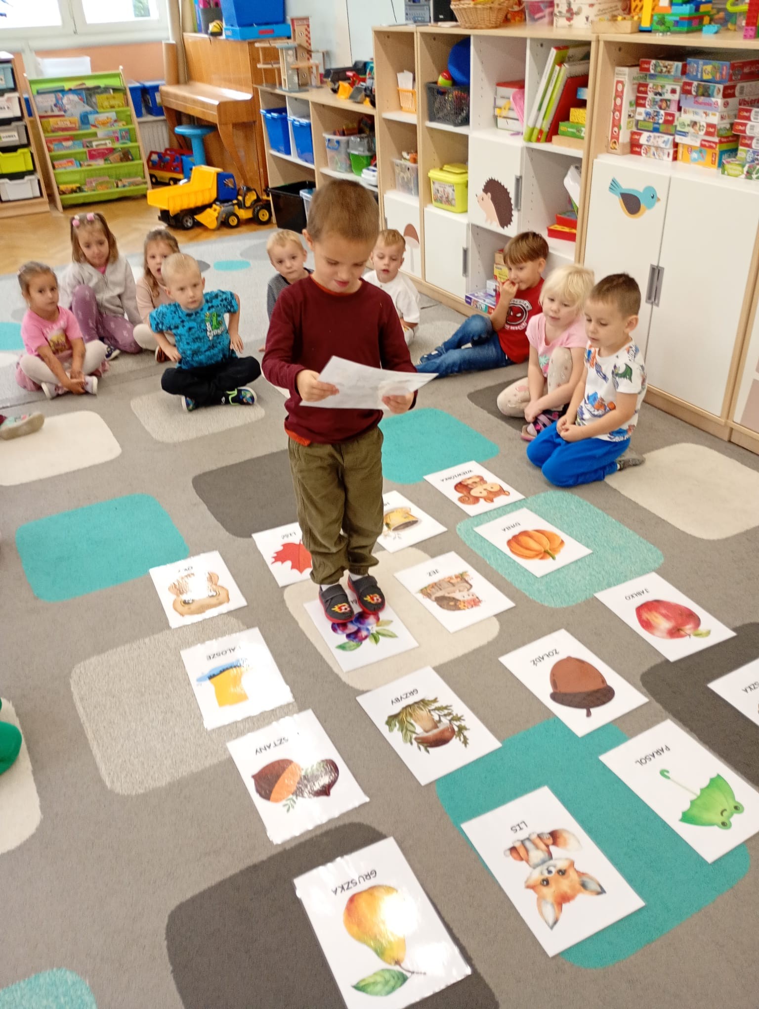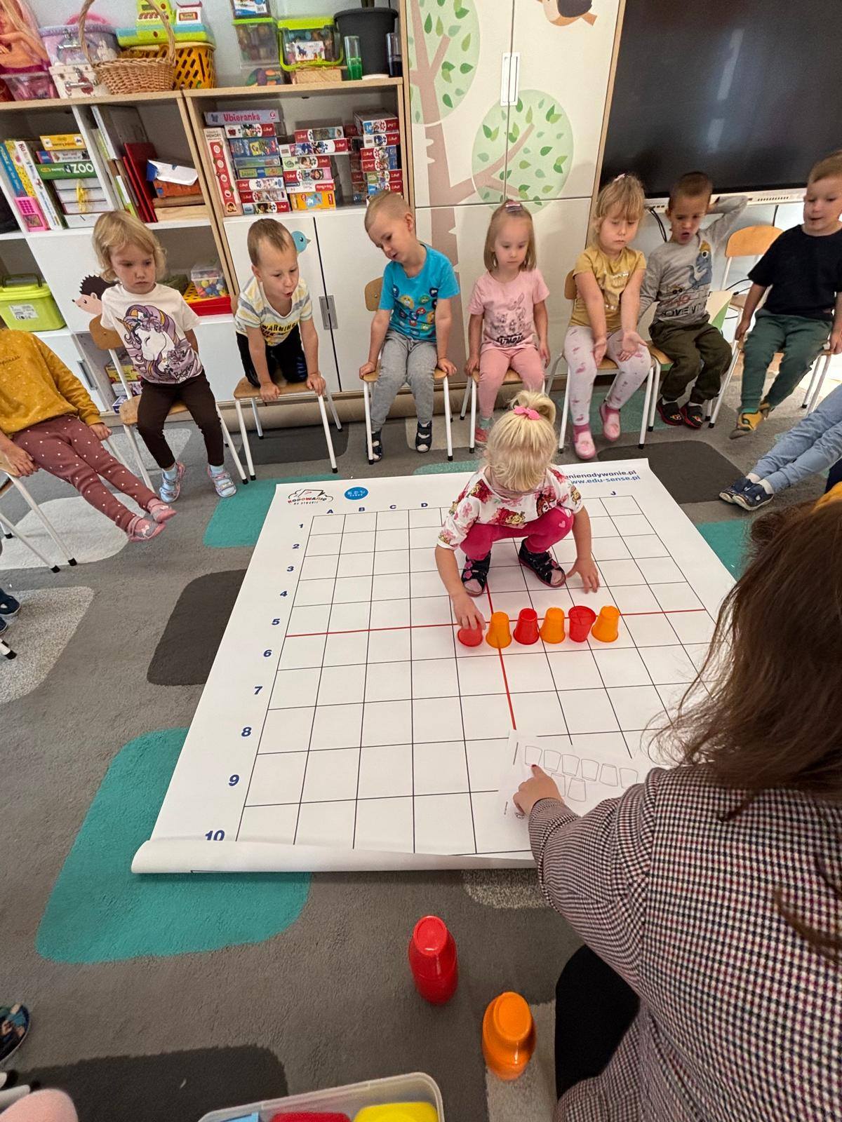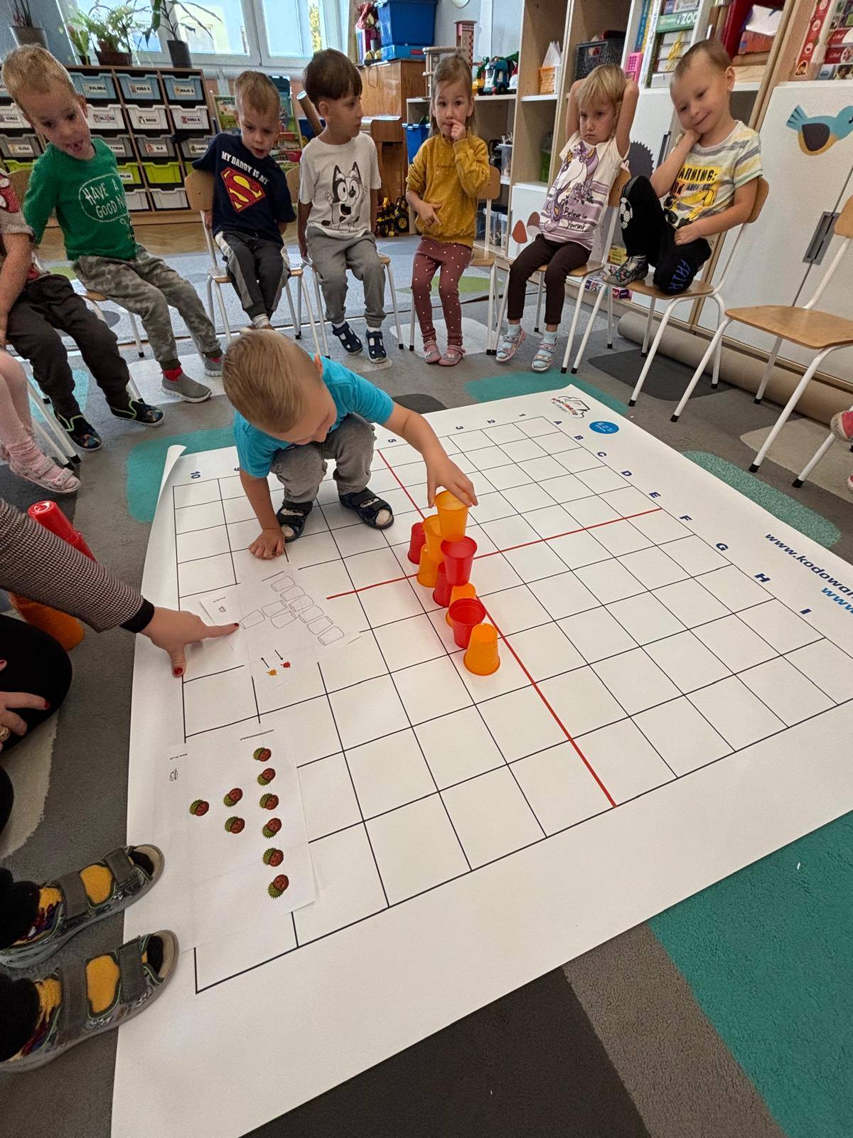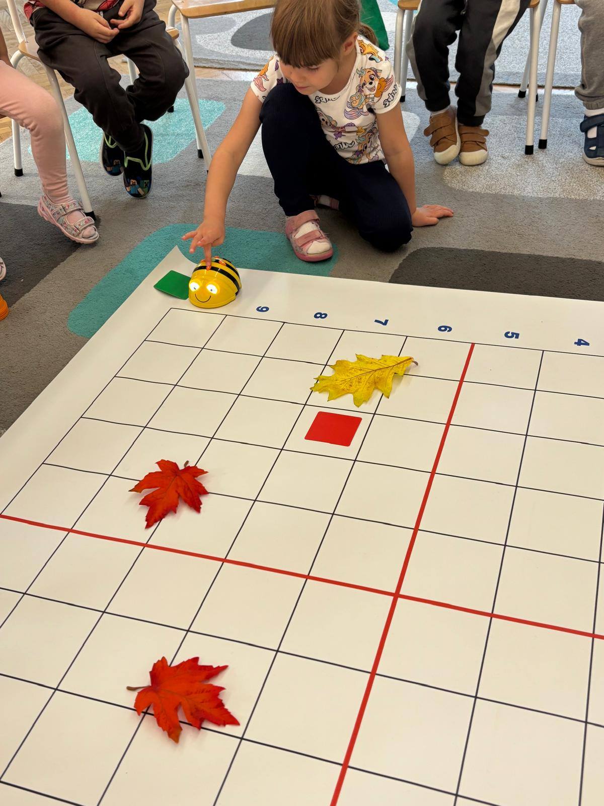Jesienne kodowanie na dywanie w Biedronkach. Podczas zajęć dzieci ćwiczyły orientację w przestrzeni, poruszając się według instrukcji słownych kolegów oraz na podstawie karty z zaznaczoną trasą.