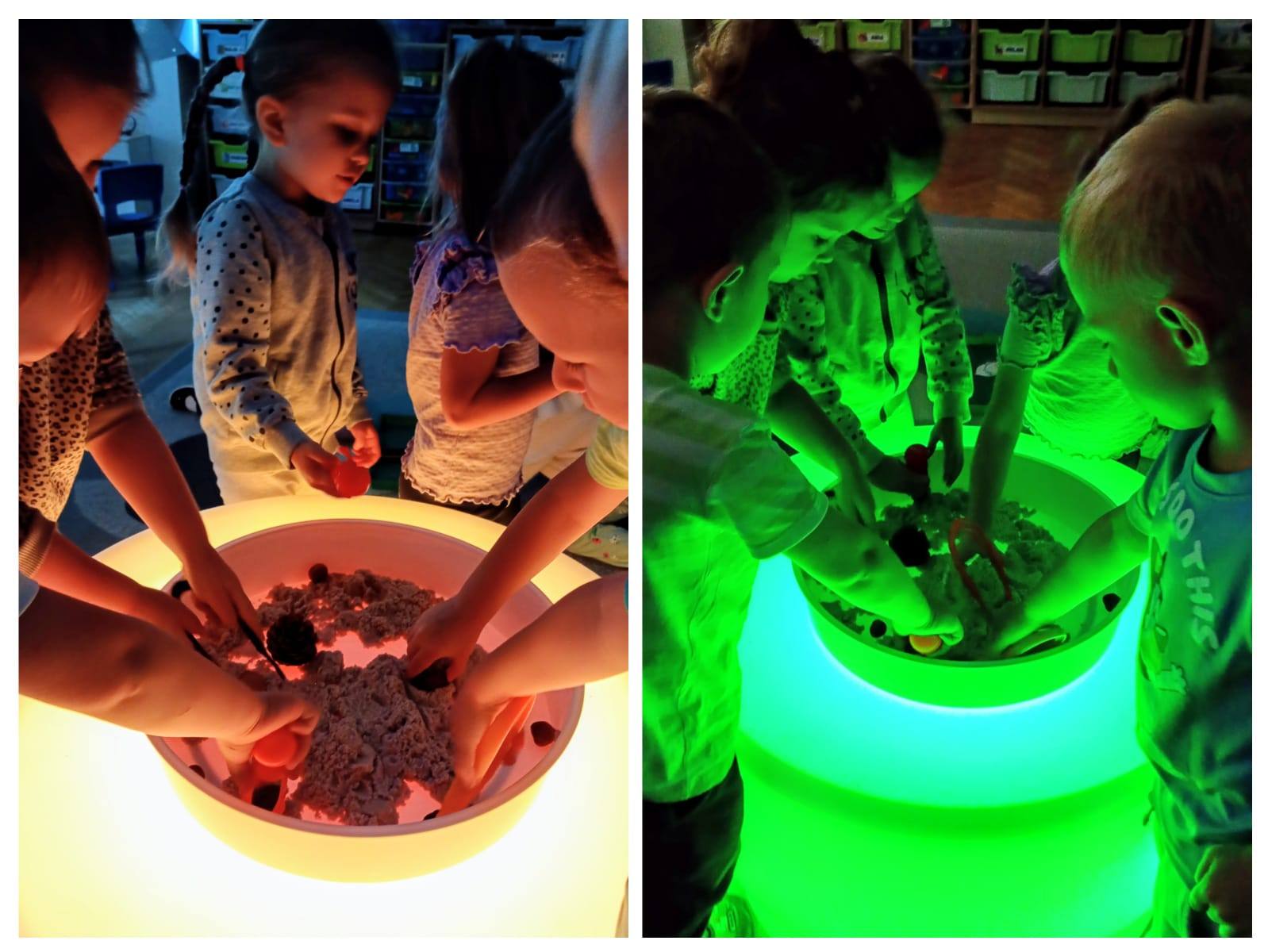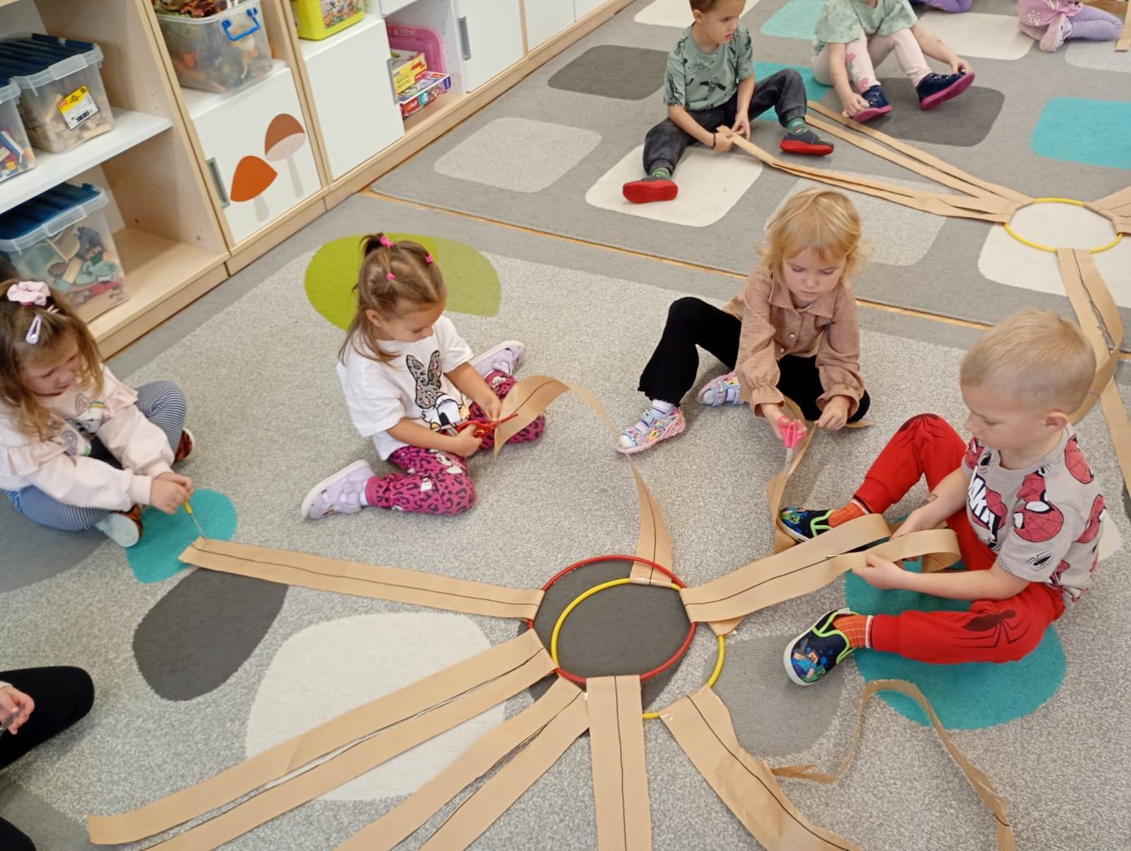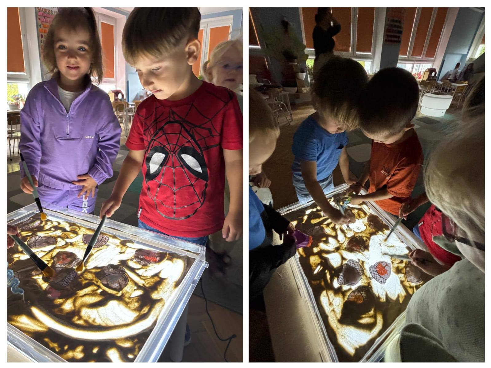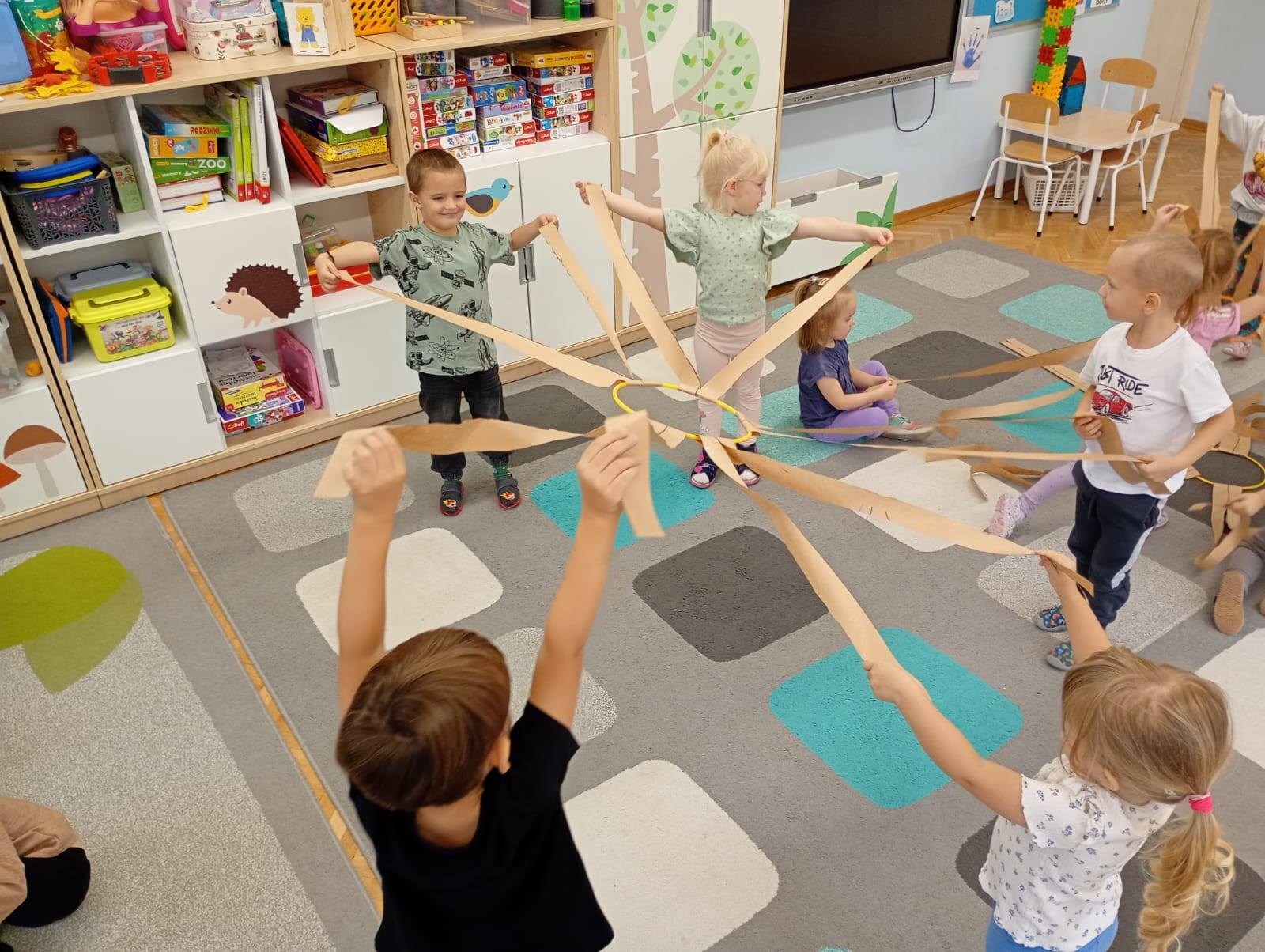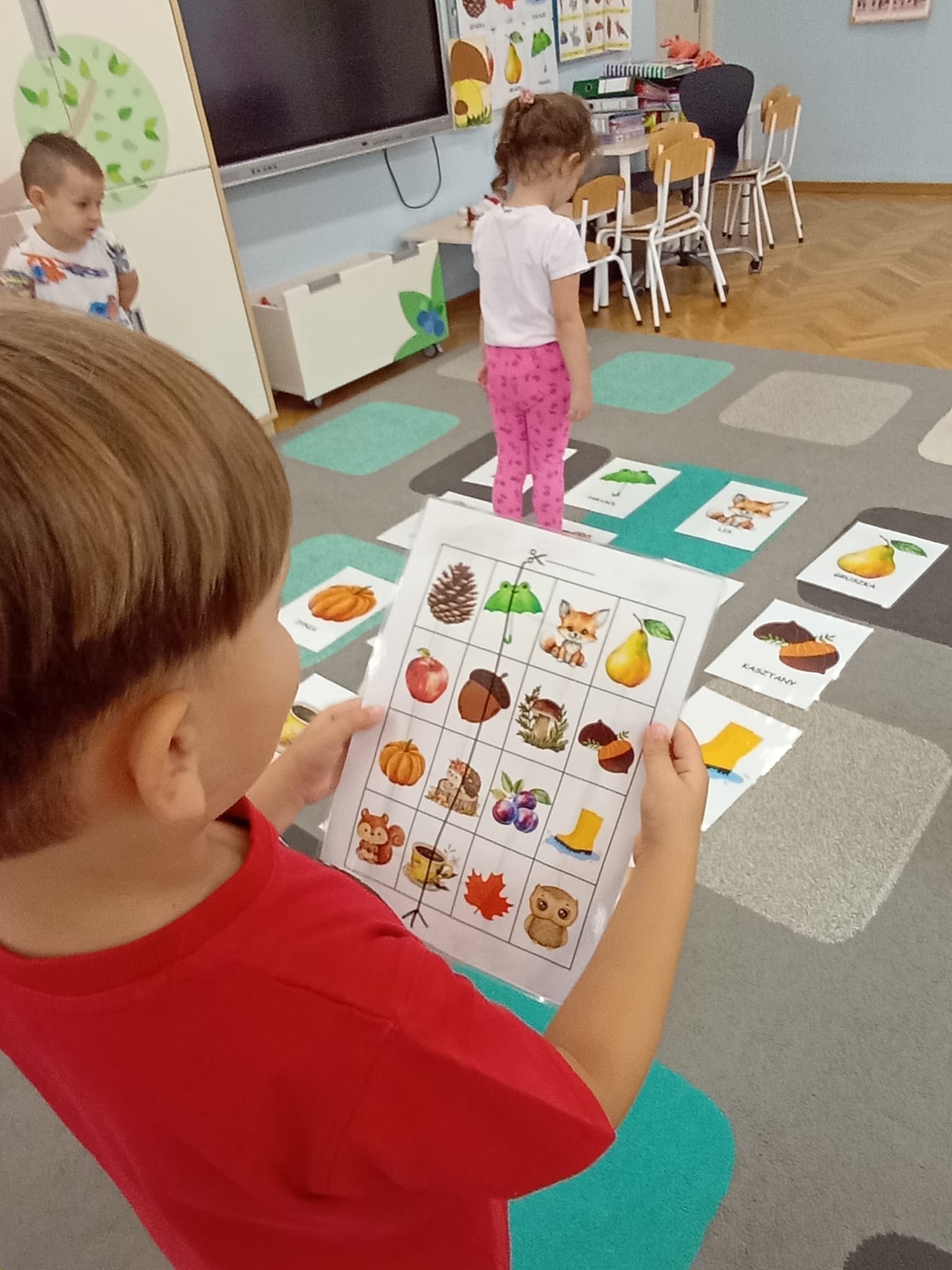 Jesienne kodowanie na dywanie w Biedronkach. Podczas zajęć dzieci ćwiczyły orientację w przestrzeni, poruszając się według instrukcji słownych kolegów oraz na podstawie karty z zaznaczoną trasą.