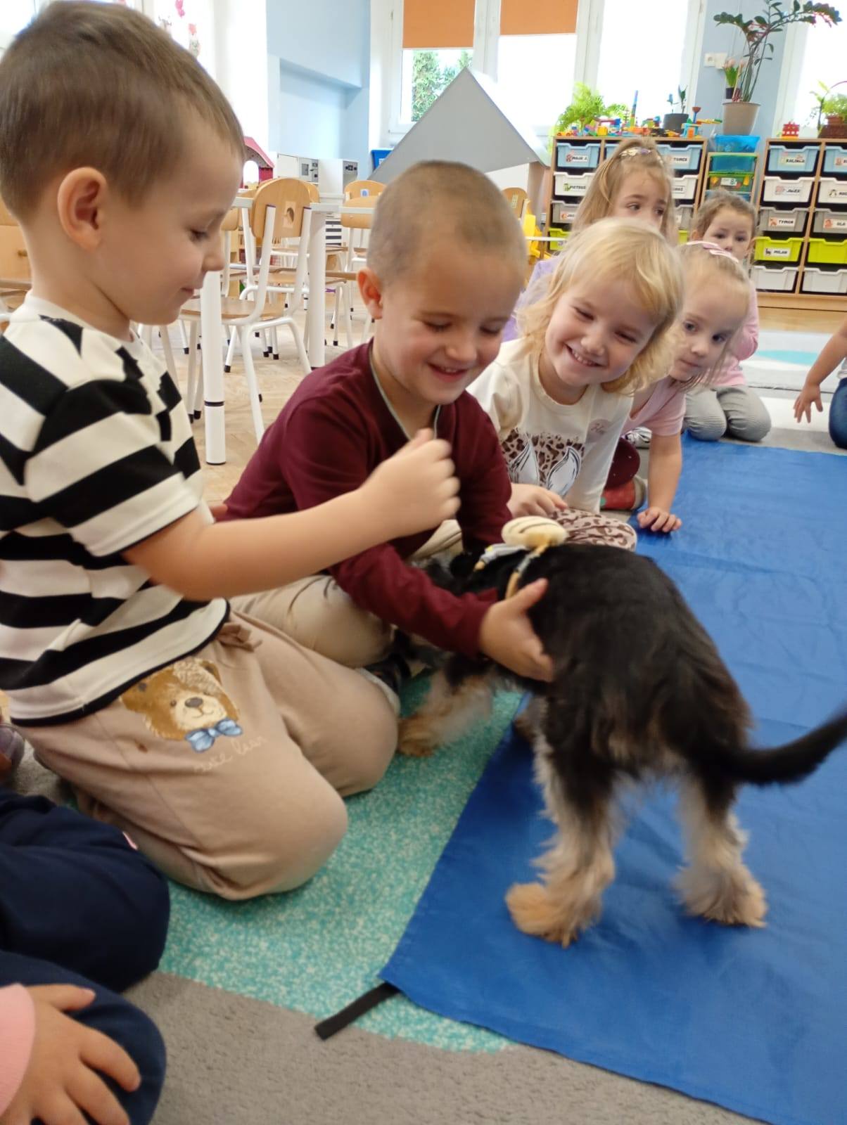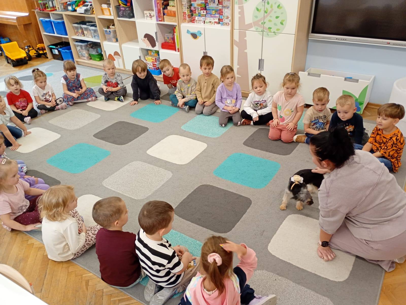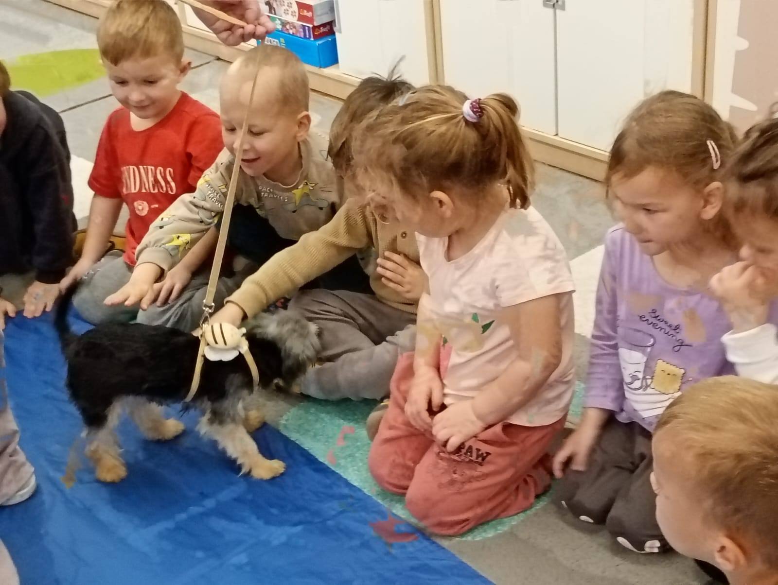 Biedroneczki odwiedziła dziś Pani Ewa i przyprowadziła czworonożnego przyjaciela. Opowiedziała dzieciom jak należy opiekować się pieskiem. Chętne dzieci miały okazję pogłaskać i przytulić pieska.