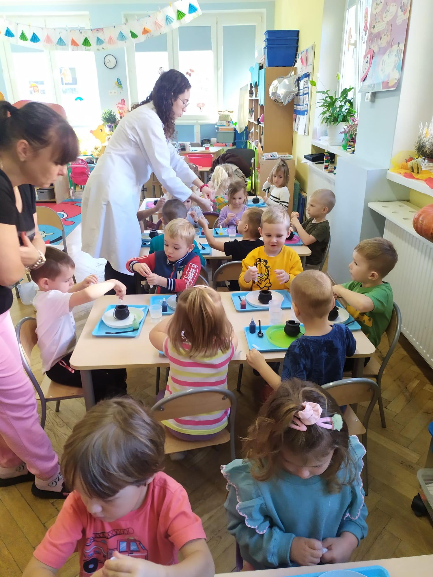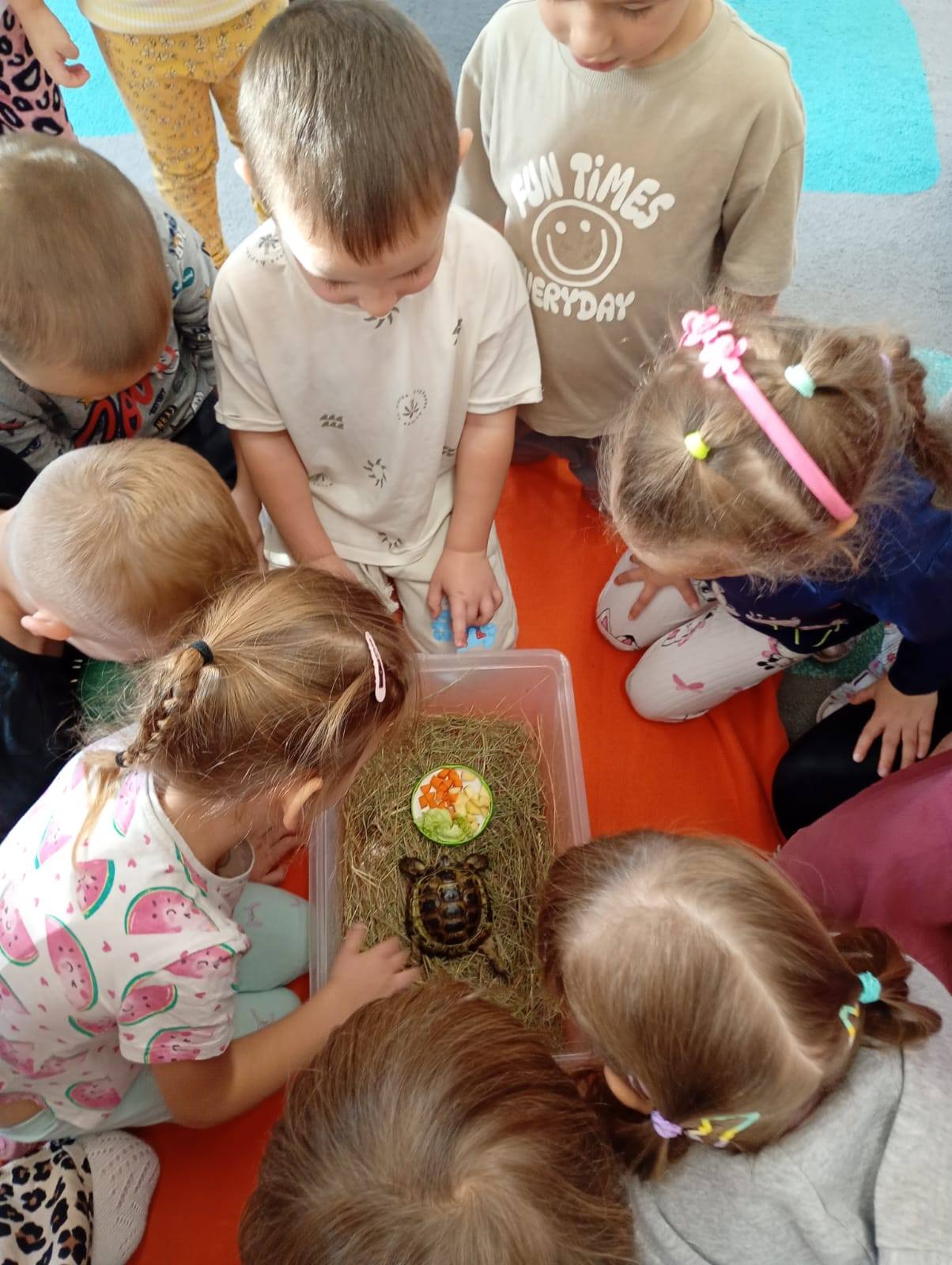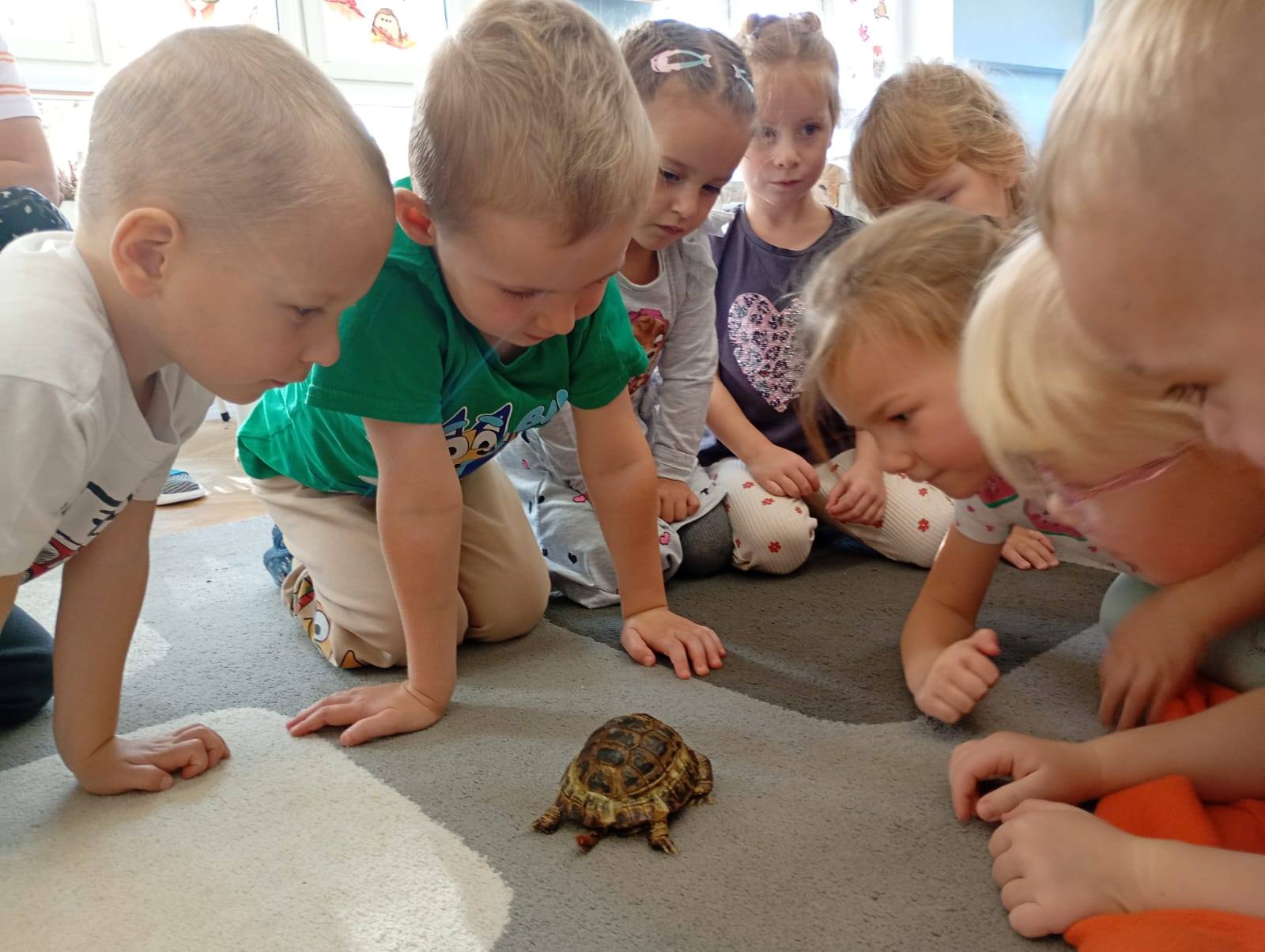 Biedroneczki odwiedził żółw Albert, przyjaciel Pani Eweliny. Dzieci wysłuchały ciekawostek na temat żółwi stepowych m.in., w jaki sposób należy się nimi opiekować, co lubią jeść, gdzie mieszkają, dlaczego żółwie chowają się w skorupie? Mieliśmy okazję obserwować jego zachowania przez cały dzień. Chętne dzieci mogły wziąć żółwia na ręce.