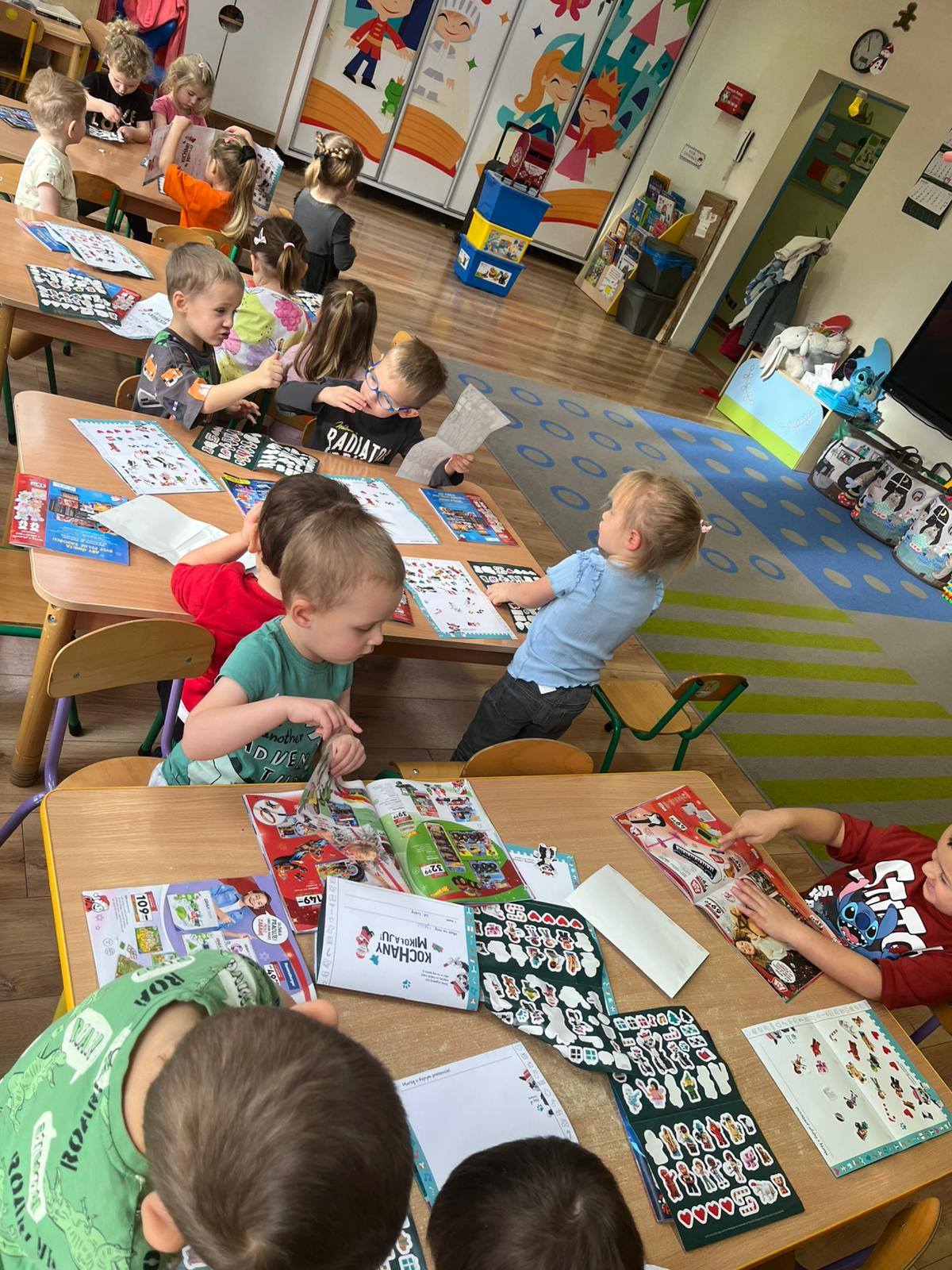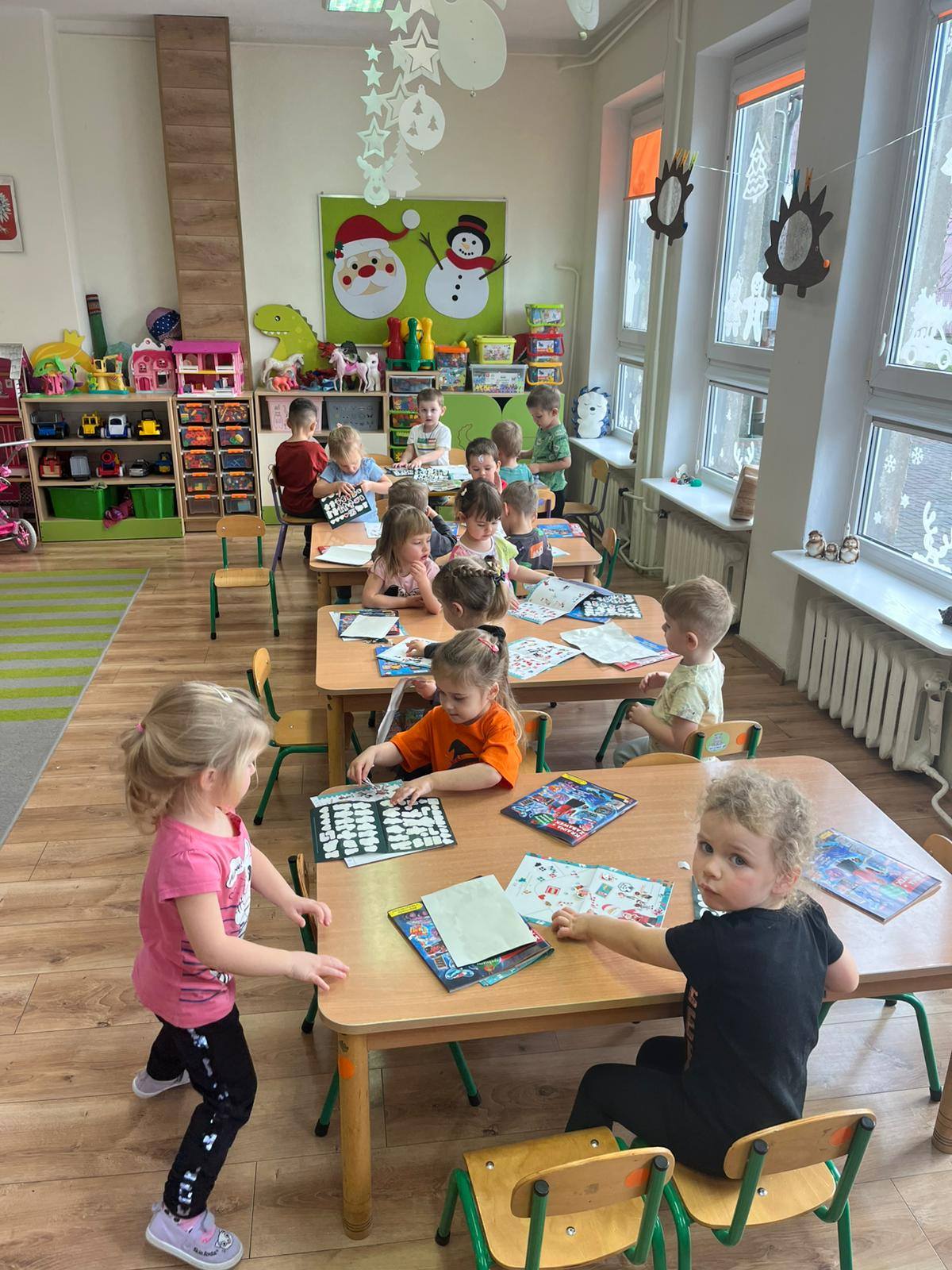 Dzieci wysłuchały czym zajmuje się dzielnicowy oraz nauczyły się w jaki sposób należy przechodzić przez przejście dla pieszych, chętni mogli również przymierzyć atrybuty prawdziwego policjanta na koniec dzieci otrzymały w prezencie kolorowanki oraz kolorowe odblaski.