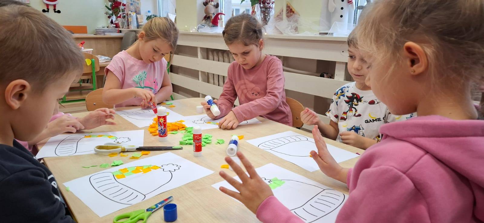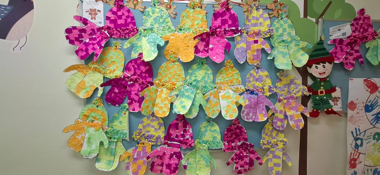 Dzieci rozmawiały o zimowym ubiorze.Nie mogło zabraknąć aktywności plastycznych podczas których przedszkolaki wykonały zimowe czapki i rękawiczki, ćwicząc sprawność manualną.