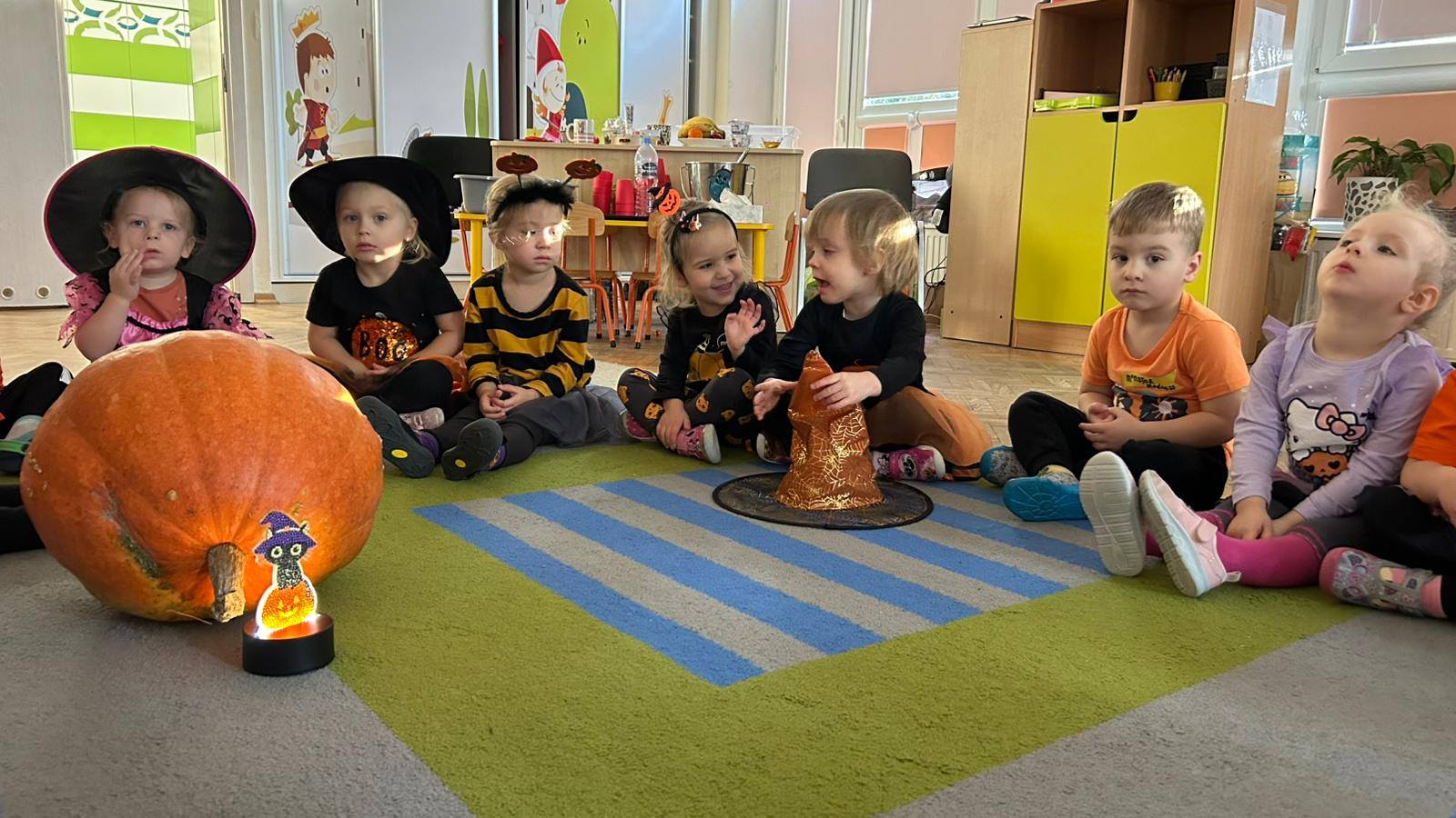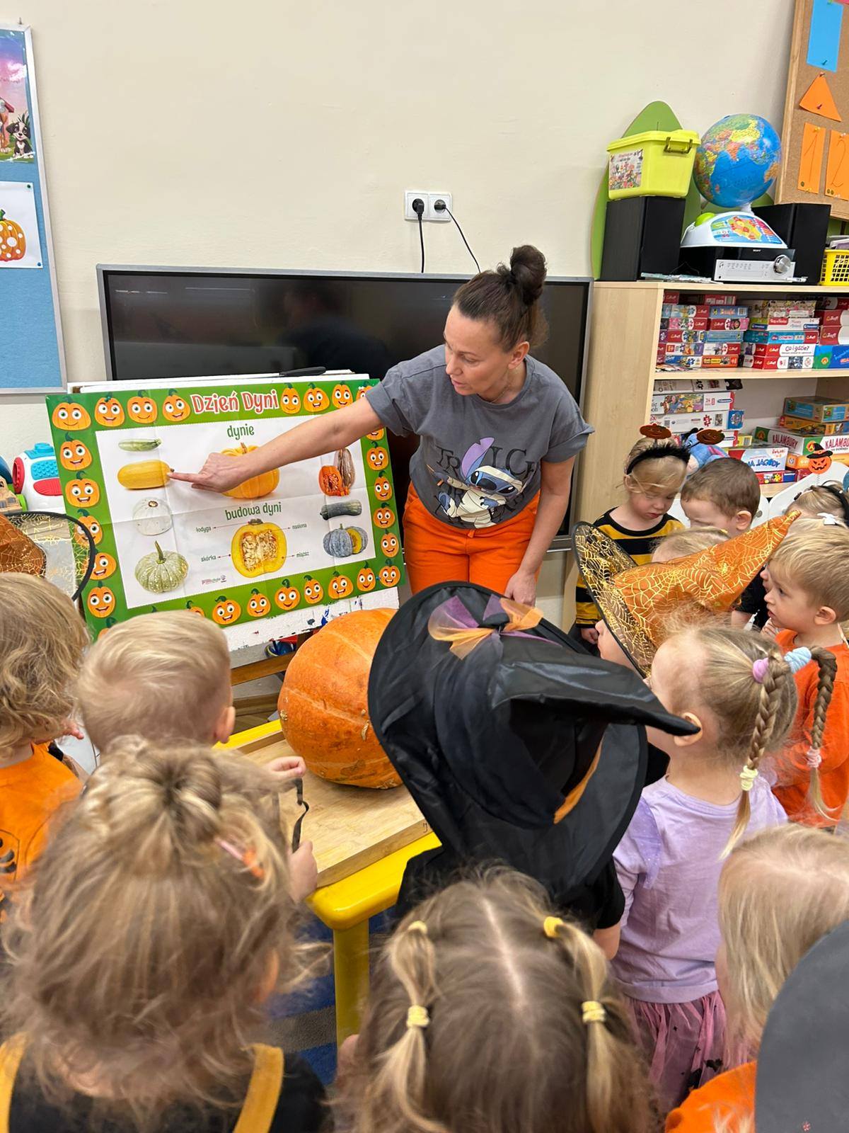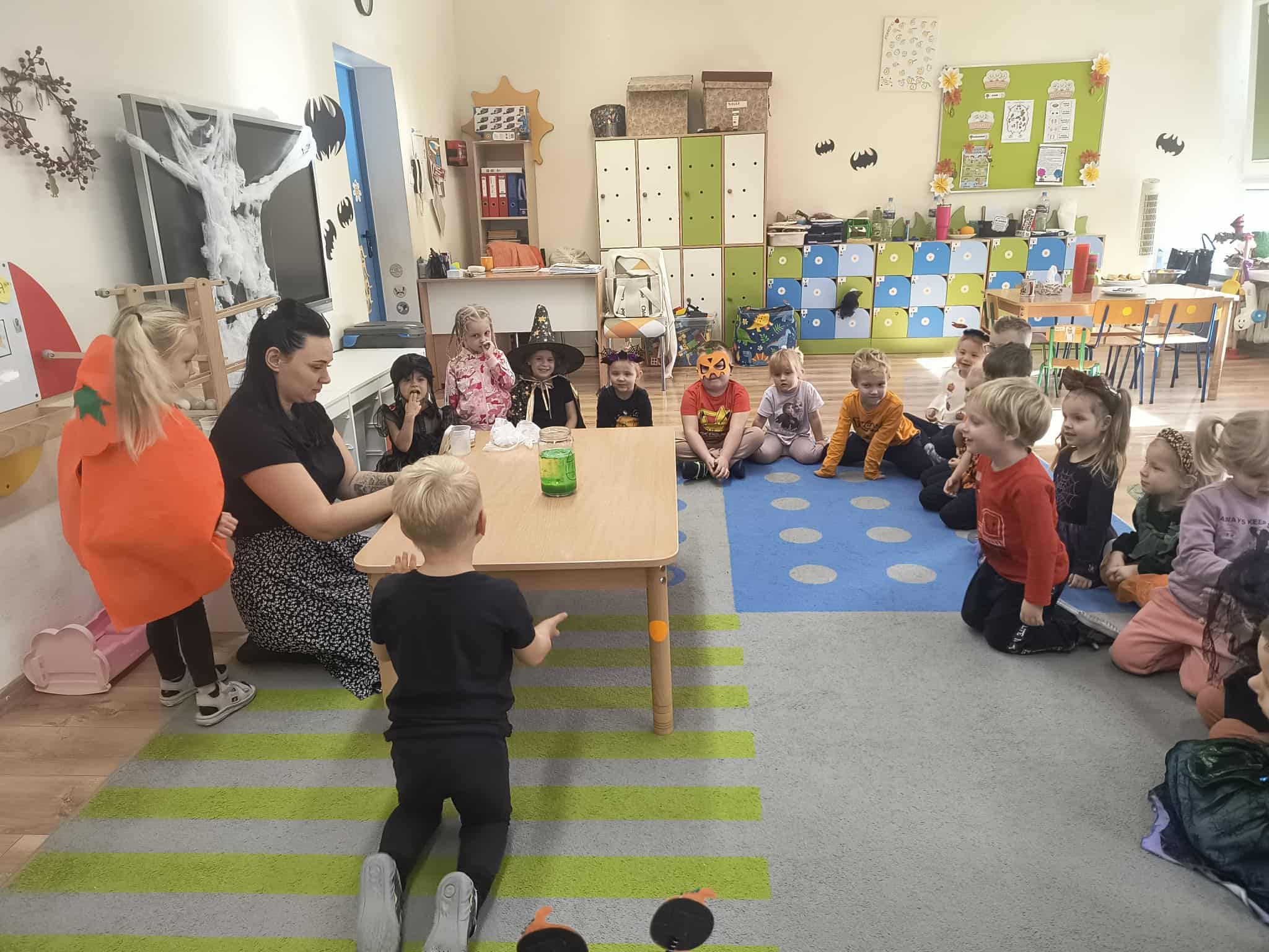 Trochę magii przy przy święcie dyni stokrotki poznały eksperymenty z wykorzystaniem różnych cieczy oraz wyklejały kapelusze.