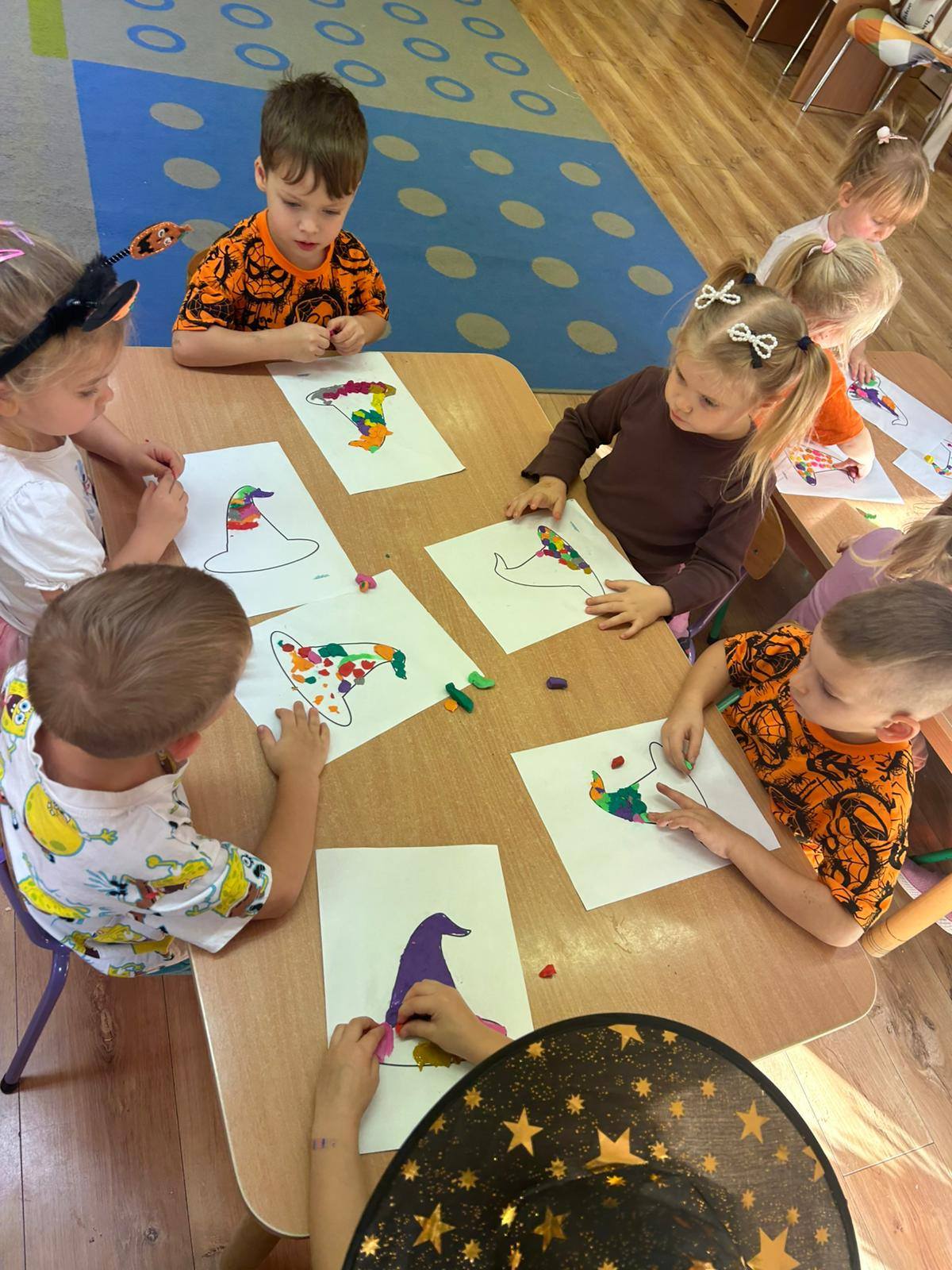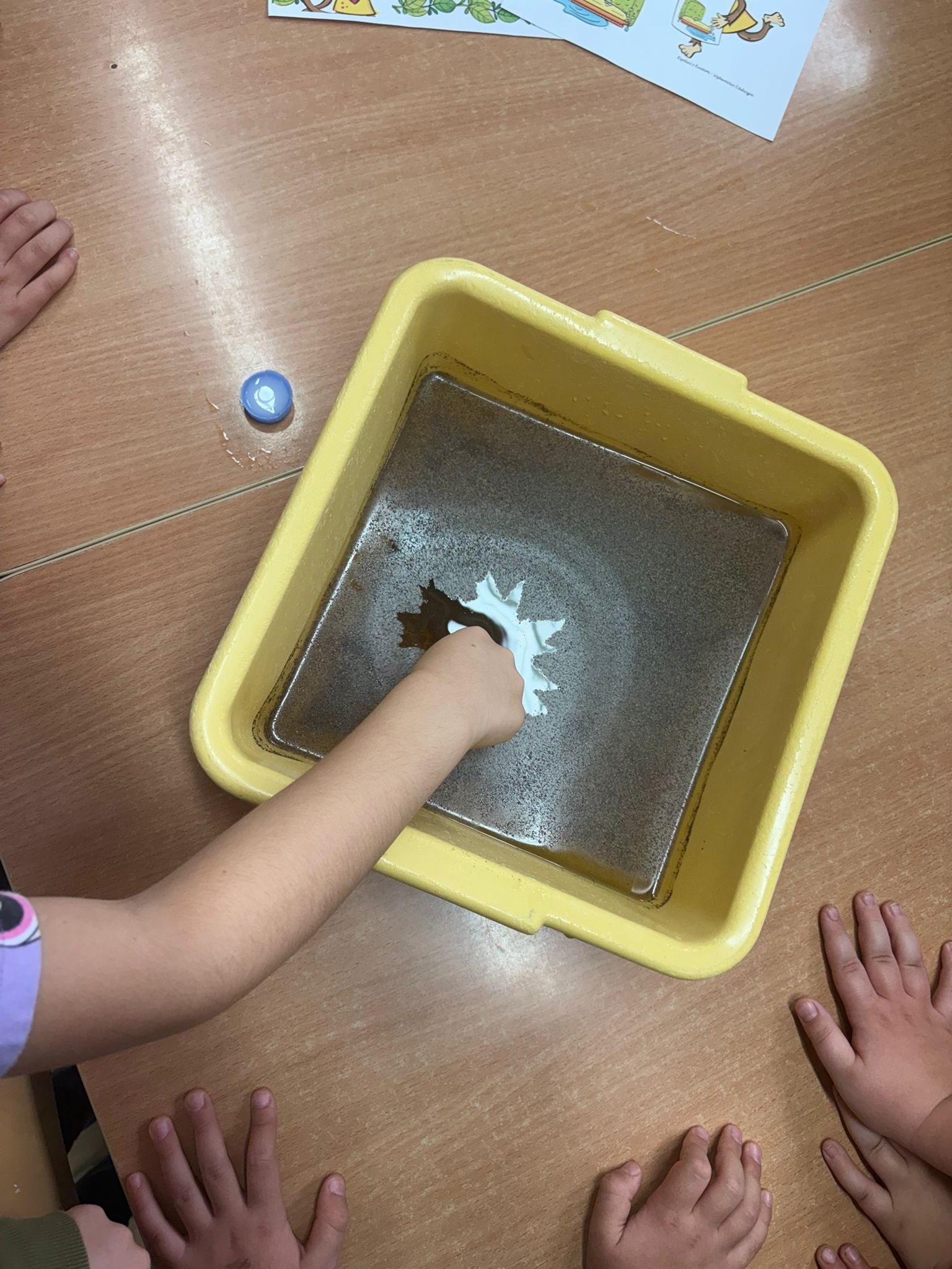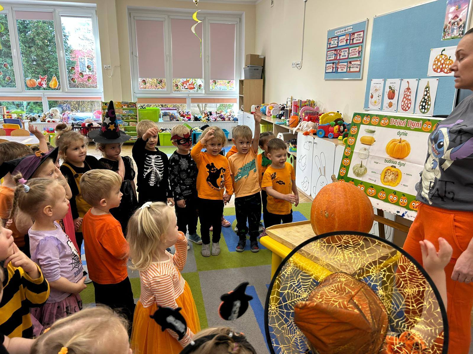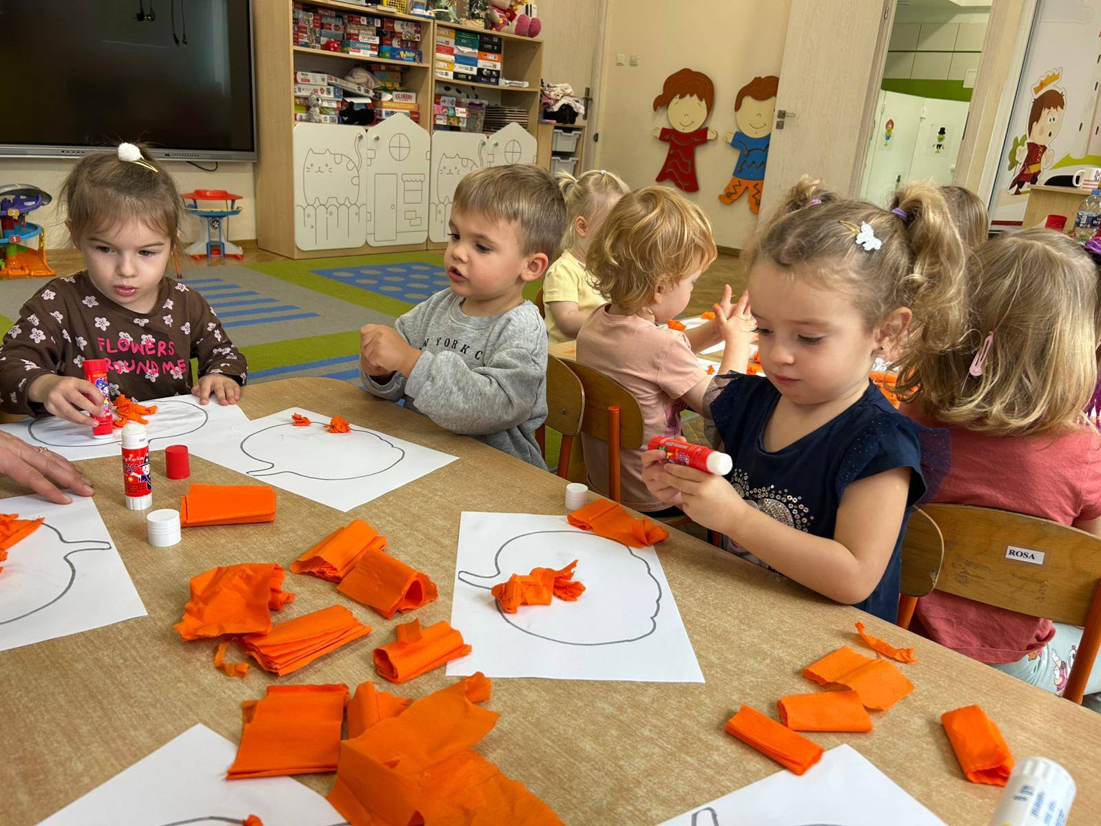 Trochę magii przy przy święcie dyni stokrotki poznały eksperymenty z wykorzystaniem różnych cieczy oraz wyklejały kapelusze.