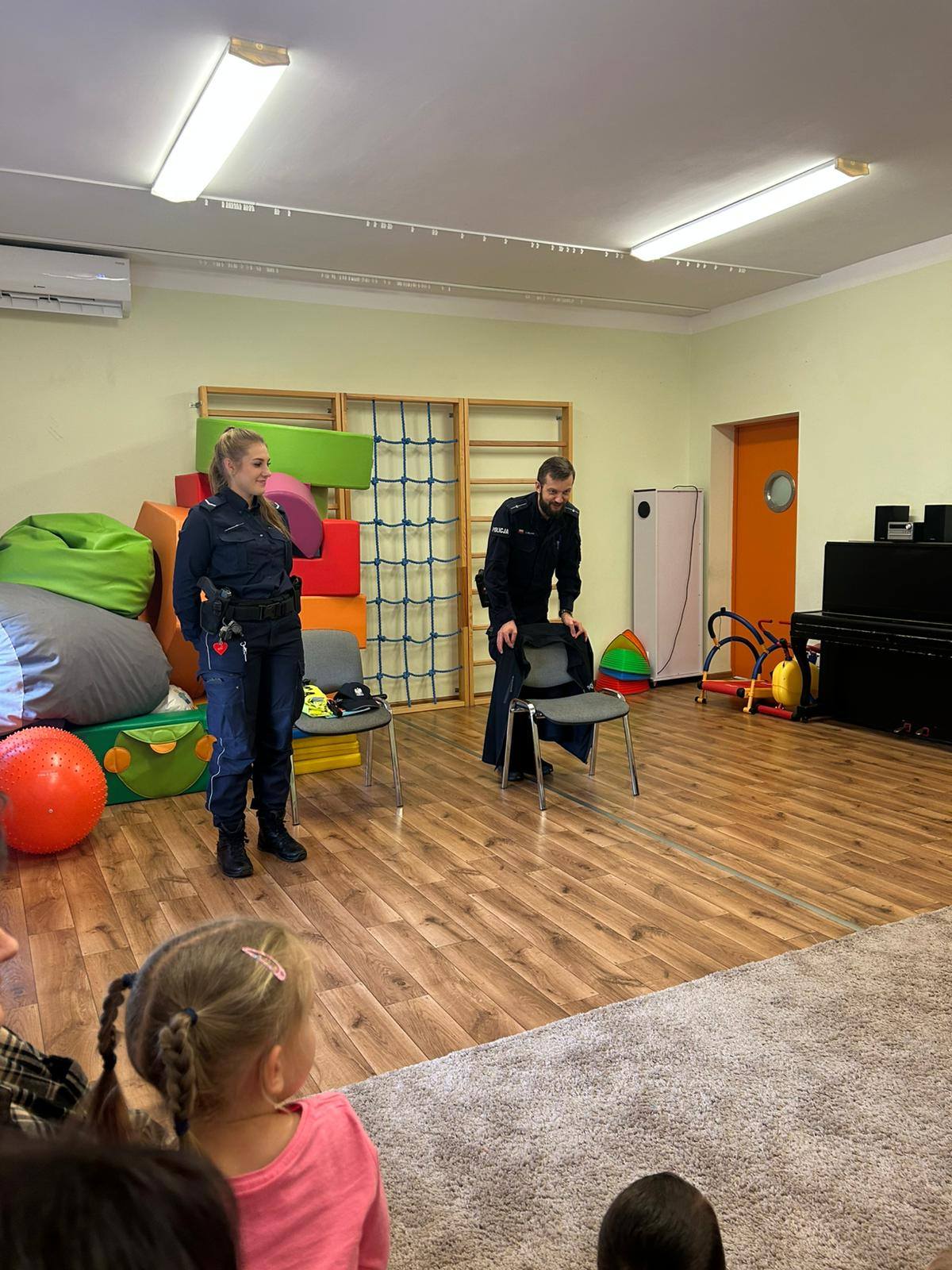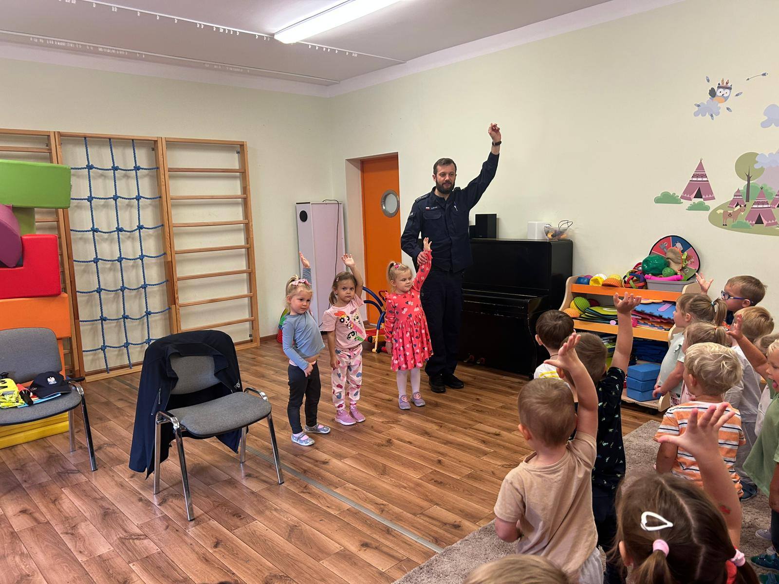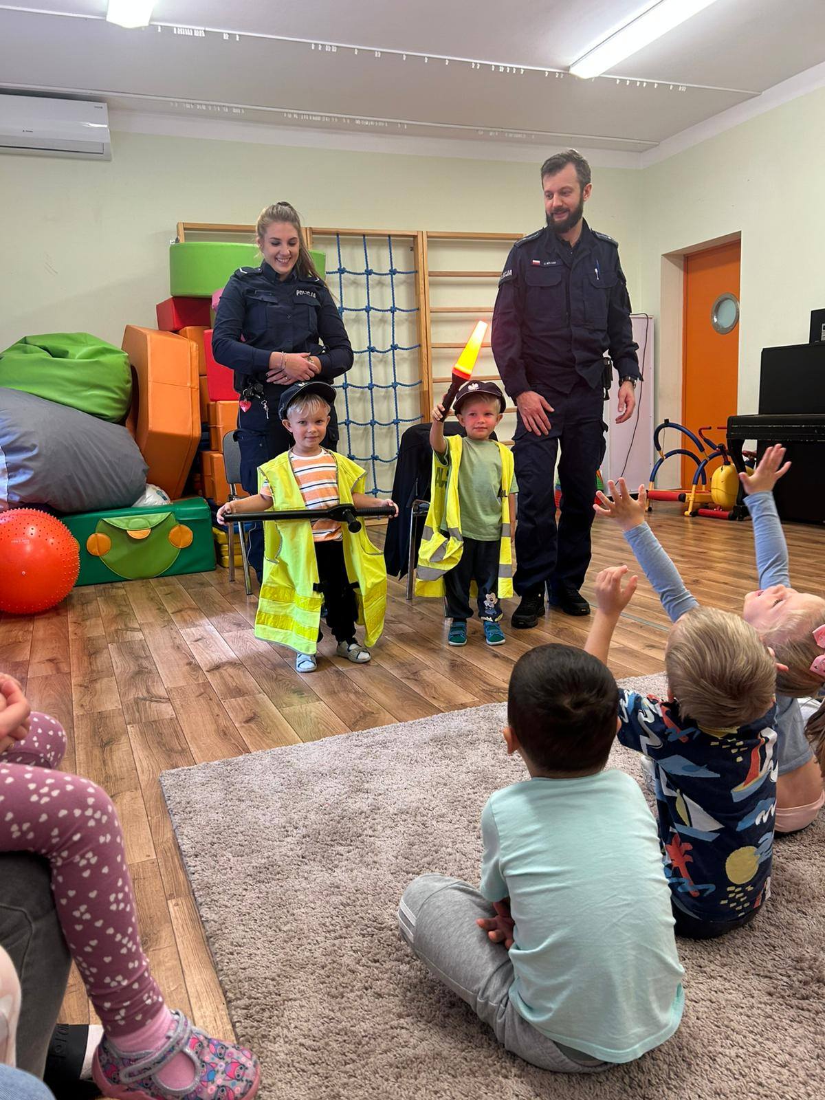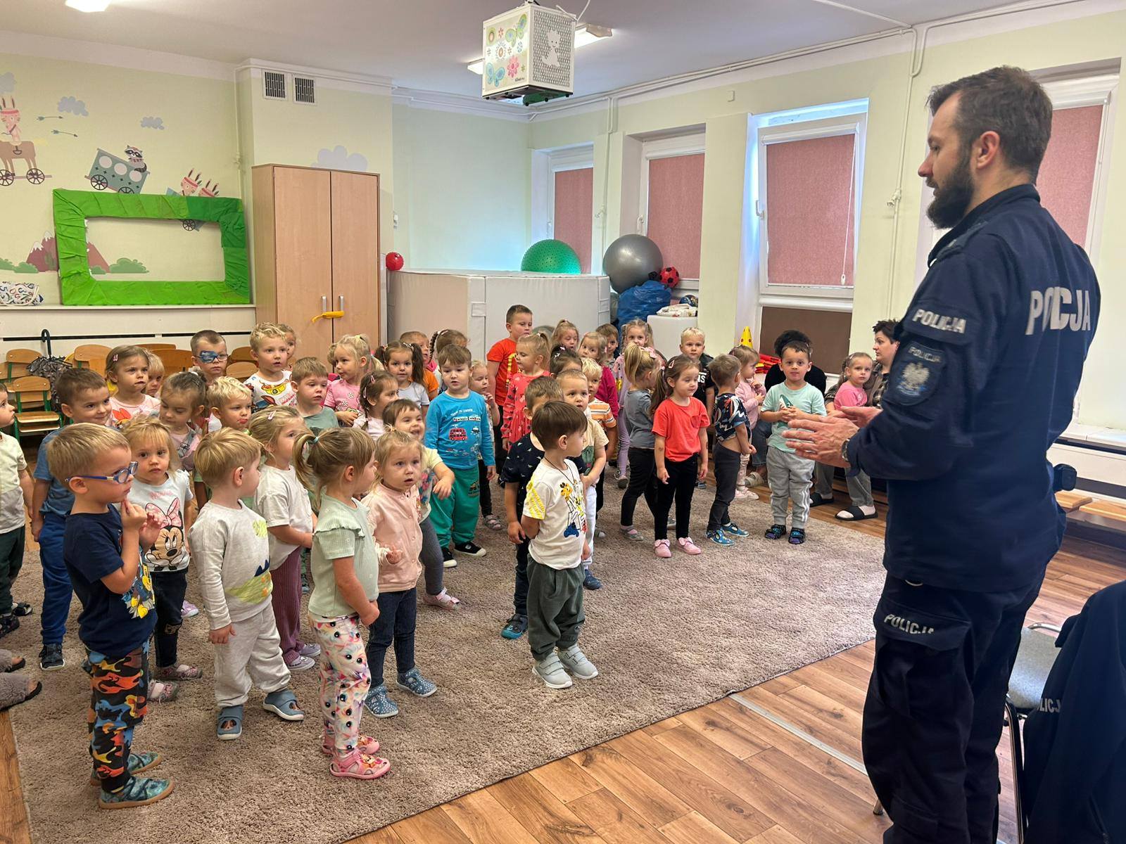 Dzieci wysłuchały czym zajmuje się dzielnicowy oraz nauczyły się w jaki sposób należy przechodzić przez przejście dla pieszych, chętni mogli również przymierzyć atrybuty prawdziwego policjanta na koniec dzieci otrzymały w prezencie kolorowanki oraz kolorowe odblaski.