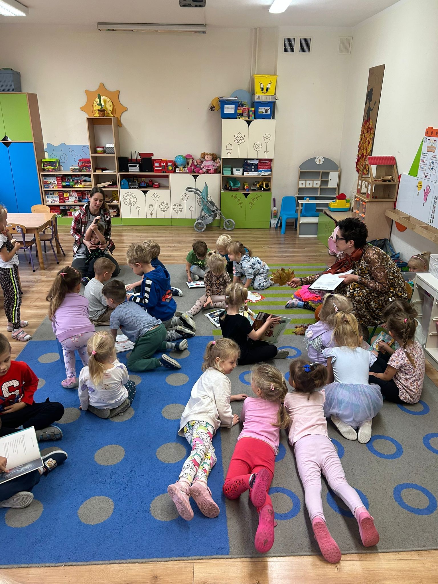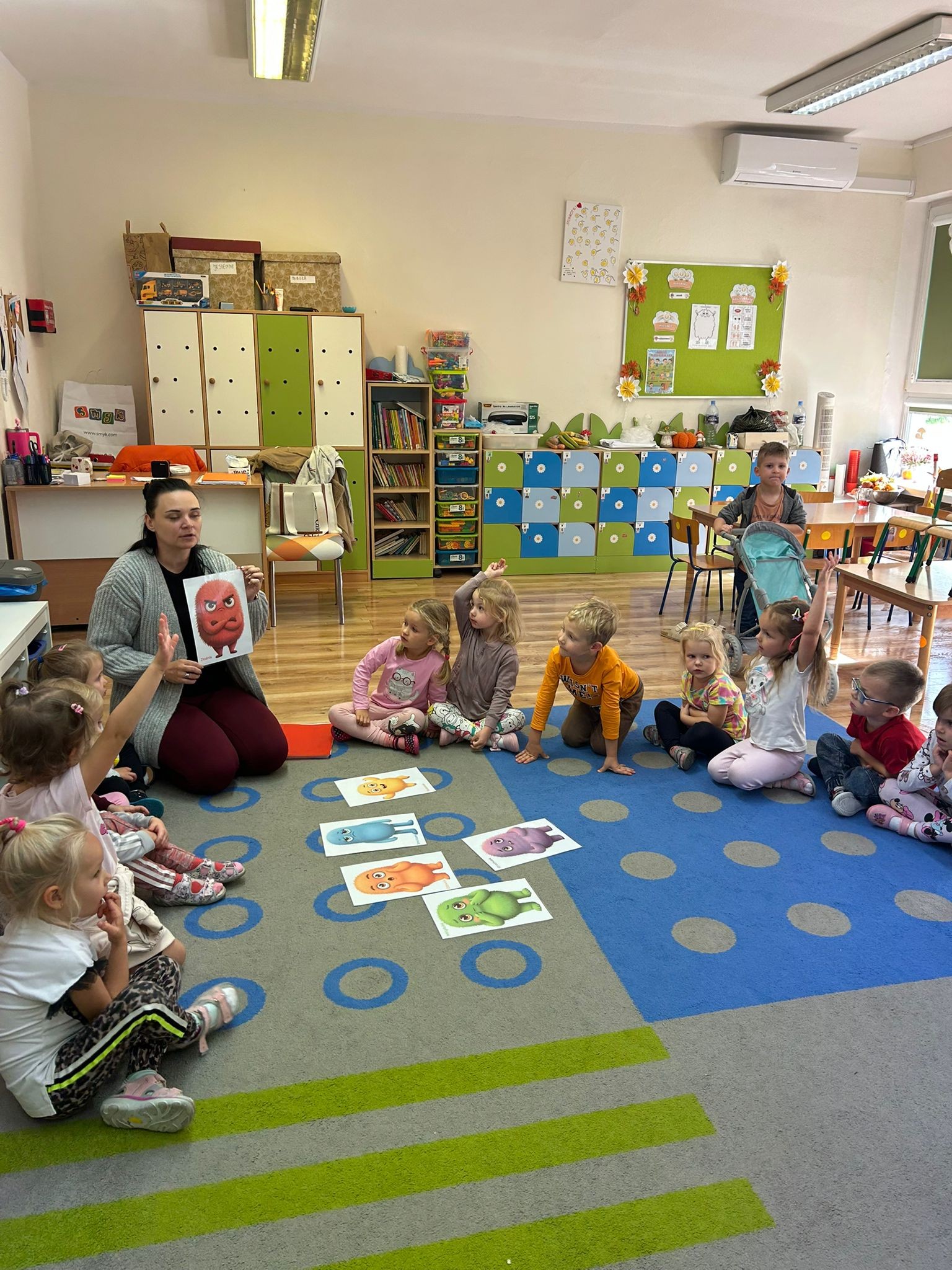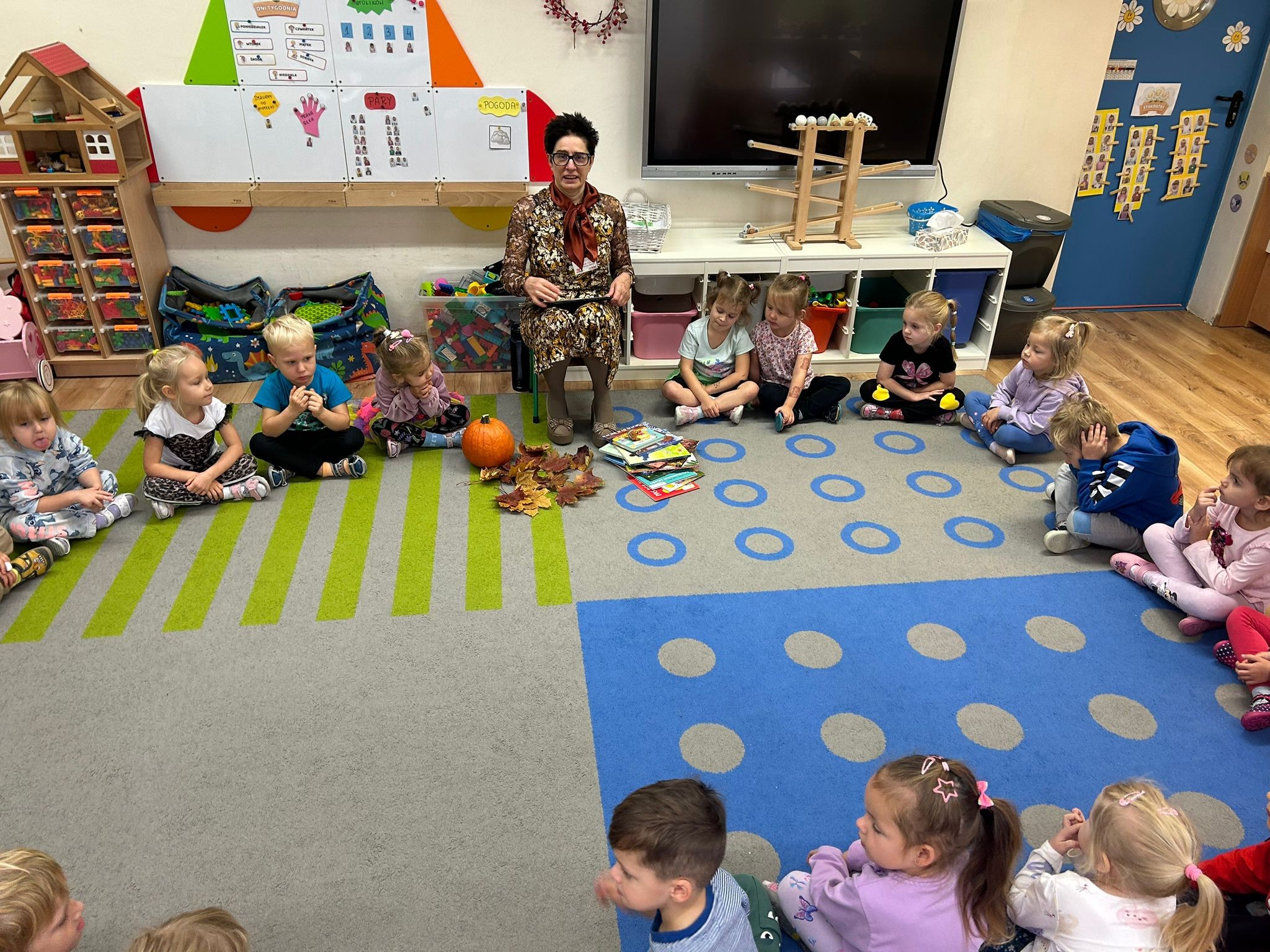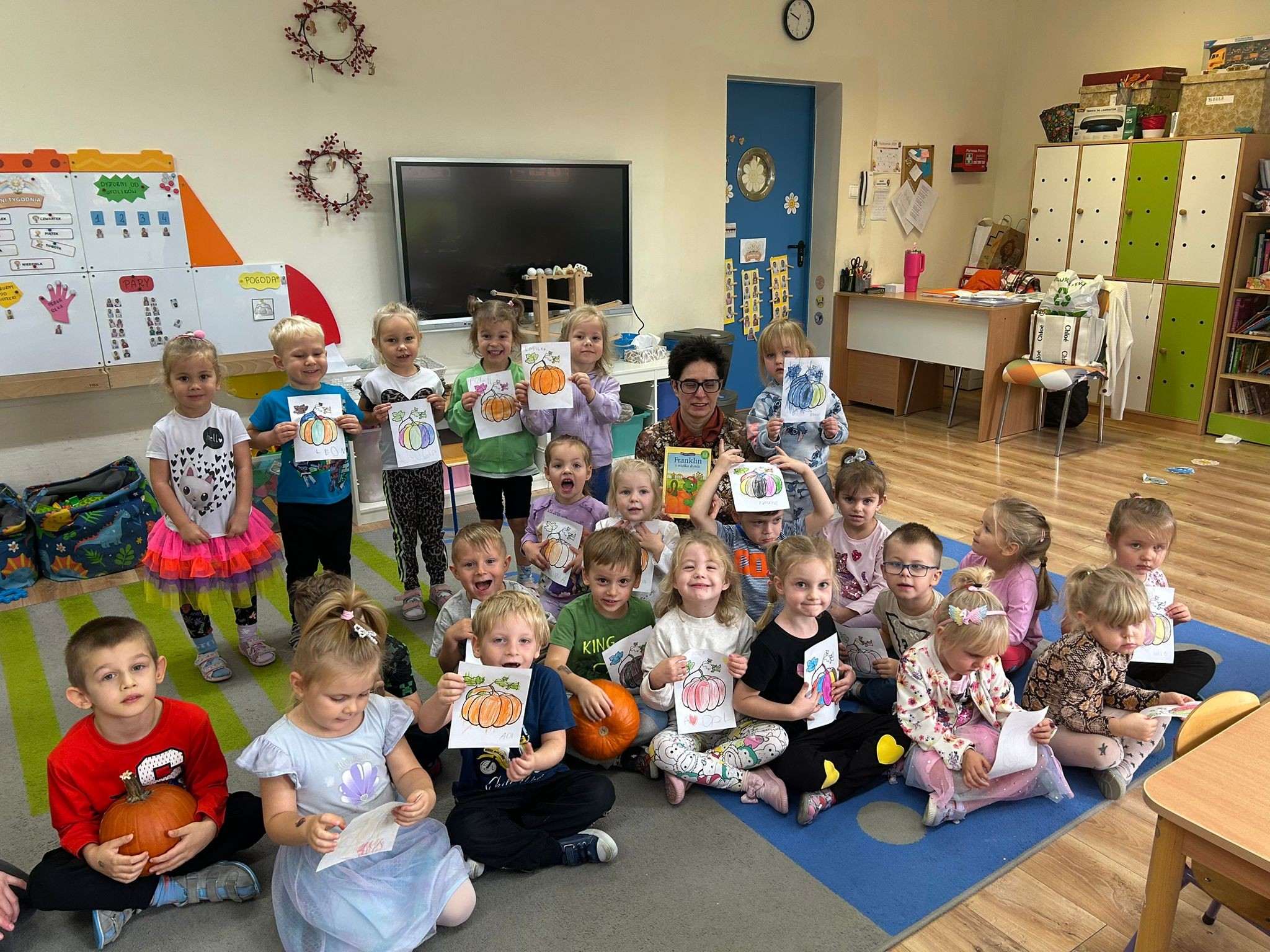 Stokrotki odwiedziła Pani Jolanta Tobjasz z biblioteki – przybliżyła dzieciom historię Franklina i wielkiej dyni. Na koniec wszyscy kolorowali własne obrazki dyni nadal ćwiczymy również podpisywanie się własnym imieniem – coraz lepiej nam to idzie !